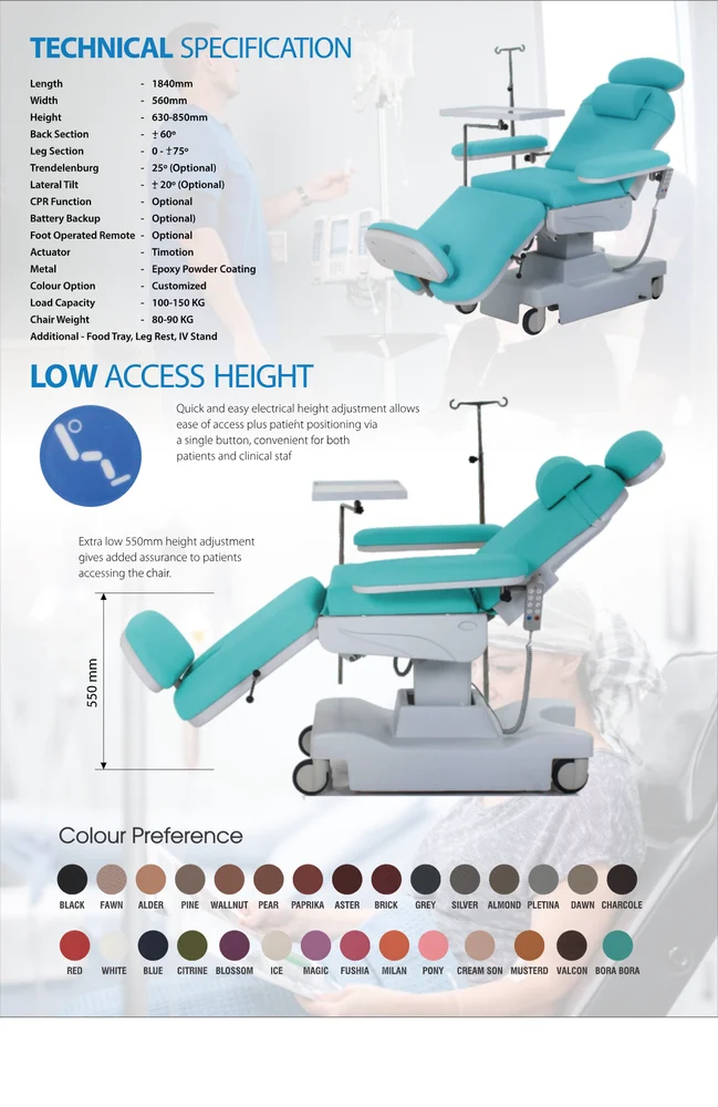 Chemotherapy Patients Chair, designed with a wide range of movement options and functionality, can help provide high-quality treatment offers multi-adjustable movement options for height, backrest, and leg rest.